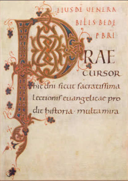 Initiale P mit goldenen Linien auf blauem Grund.