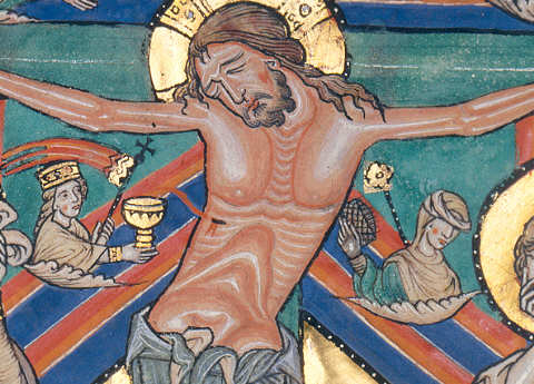 Evangelistar von Speyer (um 1220 entstanden) Detail aus der Kreuzigung: Ecclesia als das siegreiche Christentum mit dem Kelch des Blutes und Synagoge als Personifikation des "blinden" und überwundenen Judentums.