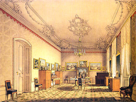 die Stuckierung an der Decke und die beiden Kabinette zu Seiten