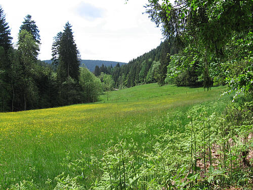 Grüne Wiesen, dunkle Wälder: Aussicht vom Flößerpfad über das sich allmählich weitende Kinzigtal.