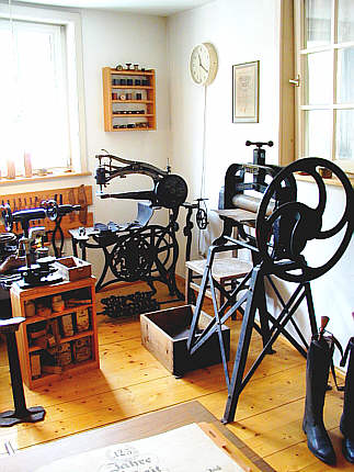 Maschinen zur Lederbereitung (vorne) und zur Schuhmacherei (Nähmaschine, hinten)