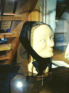 die schwarze Haube. Sie ist über der Stirn sehr flach und