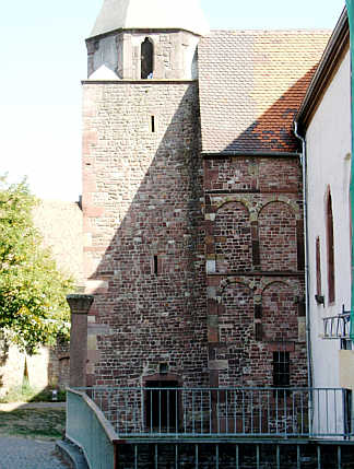 Romanische Blendarkaturen (12. Jahrhundert) am Verbindungsbau zum Kirchengebäude. Im Vordergund freigelegte Mauerreste des römischen Kastelltors.