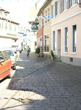 In den Straßen der Stadt sind die ergrabenen und erschlossenen Mauern der römischen Kastelle durch Sandsteinpflaster deutlich gemacht.