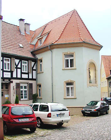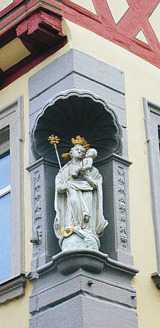 der Ecke steht in einer Nische eine Madonnenfigur. Sie
