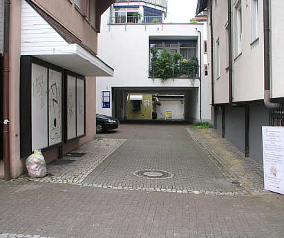 Im Stadtbild ist der Verlauf des ehemaligen Kanals, der nur stellenweise durch flache Bauten überbaut worden war, noch gut als eine gleichmäßig breite Lücke zwischen zwei Häuserblöcken zu verfolgen - so wie hier in der Nähe der ehemaligen Stadtmühle. |
