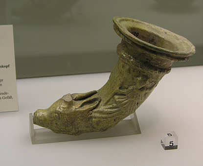 In einen Ochsenkopf auslaufendes Gefäß zur kultischen Spende von Wein bei Opferhandlungen