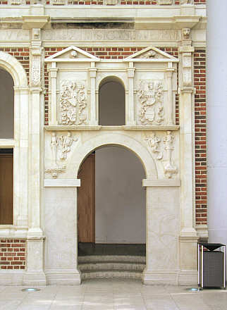 Zugangsportal im rechten Flügel Relieffiguren in den Bogenzwickeln, darüber zwei Wappen des Bauherren