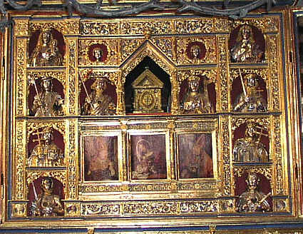 In der Mitte der Reliquienschrein des heiligen Viktor, 1129, als Hausreliquiar mit Satteldach gestaltet.