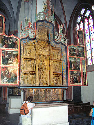 Meisterwerk der spätgotischen Schnitzkunst, gearbeitet von Henrik Douvermann, 1535/36. Beonders bemerkenswert die Predella mit dem schlafenden Jesse