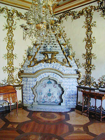 Eckkamin mit weiß-blauen Nürnberger Kacheln, Verschlussplatte im chinesischen Stil und Aufsätzen für das Arrangement von Porzellanstücken