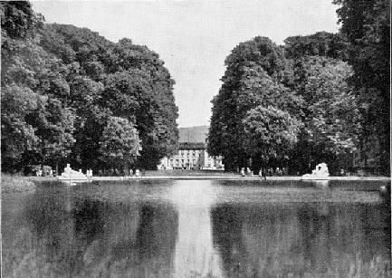 Blick von der Rückseite des Großen Teichs durch den Schlosspark auf die Westfassade des Schlosses, um 1930