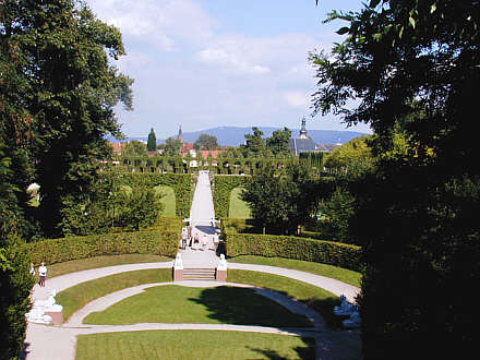 Der Apollotempel ist gleichzeitig ein Belvedere mit Ausblick über den Orangeriegarten und über den englischen Garten. Von seiner Plattform öffnet sich der Blick über das Freilufttheater zu den zu Arkaden geschnittenen Lindenbäumen vor der Orangerie, die die Verbindung von Natur und Architektur symbolisieren.