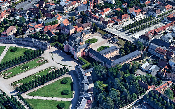 Im Zentrum der Altbau aus dem 16./17. Jahrhundert. Die daran anschließenden Ehrenhofflügel von 1710-14 öffnen sich zur Stadt hin. Rechts zur Stadt das Tor zum Schlossplatz mit den Wappen der kurfürstlichen Familie (1713) und der Beginn des Schlossplatzes mit der nach Heidelberg ziehenden Schlossachse. Am linken Bildrand die beiden Zirkelbauten (1749ff), dazwischen der Westflügel (1715-18)