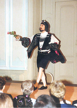 Mode und TanzEine Revue durch dreihundert Jahre Mode und Tanz im Schwetzinger SchlossZu einem Augenschmaus lud die Schwetzinger Schlossverwaltung am Samstag, dem 14. August 1999 in den Zirkelsaal des Schlosses. Die "Danzatori Palatini" und der "Historische Tanzkreis Bensheim" führten historische Tänze von der Renaissance bis zum Biedermeier vor. Susan Richter moderierte und erläuterte die Eigenheiten der damaligen Kleidung. |