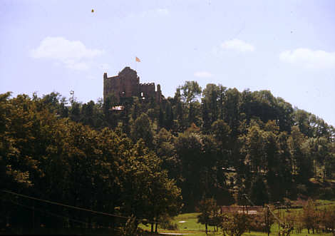 Orkan Lothar befreite die Nordseite der Burghügels vom Baumbewuchs, so dass jetzt der Alte Palas und die Hofmauer von weitem zu sehen sind.