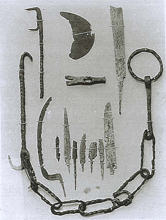 Werkzeuge, Unten eine Herdkette zum Aufhängen des Kochtopfes, links unten eine Sense, daneben Messer
