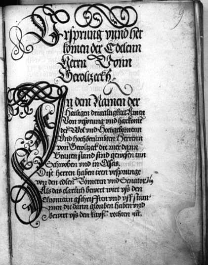 Beginn der Chronik: "Ursprung und herkomen der Edelenn Herrn Vonn Geroltzeckh"