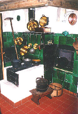 Küche: links Spülstein und Abtropfbrett, rechts der gemauerte Herd Die Besitzerin des Hauses kochte allerdings auf einem modernen Herd.