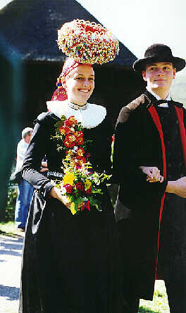 Die Braut im Festtagskleid mit weißem Faltenkragen und dem typischen Gutacher Schäppel, der Bräutigam im schwarz-roten Festtags-Gehrock