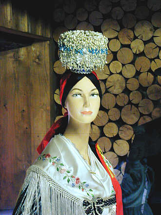Schäpel der Festtagstracht im blau-silbernen Grundton mit langen roten Bändern