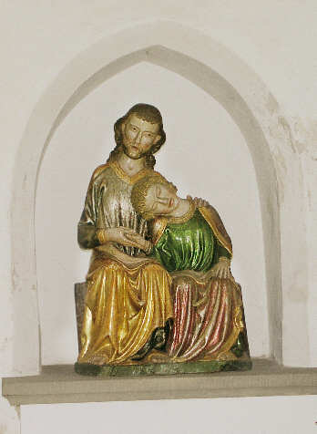 Christus und Johannes Holzschnitzarbeit mit der Darstellung Christi und des an seiner Brust ruhenden Lieblingsjüngers Johannes, frühes 14. Jh., Fassung barock