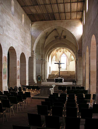 Romanische Pfeilerbasilika des frühen 12. Jahrhunderts. Flache Holzdecke im 19. Jahrhundert erneuert. Der gotische Chor wurde 1469 durch Verlängerung nach Osten neu errichtet. Hochchor durch Überbrückung des Kreuzgangs.