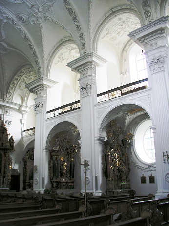 Wandpfeilerordnung im Langhaus mit Seitenkapellen und Emopren, letztere sind durch einen Laufgang untereinander verbunden.