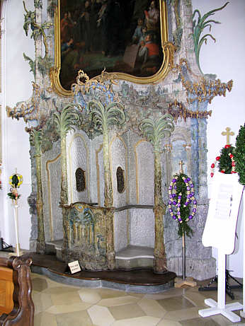 Ein Kunstwerk für sich stellen die Beichtstühle mit stuckiertem Palmettenzierat von Johann Joseph Christian (1747-58) dar.