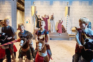 Die Ausstellung „Die Ritter. Leben auf der Burg“ vertieft das Thema Ausrüstung und Bewaffnung des Ritters anschaulich: Anhand von Repliken können Kinder durch eigenes Anprobieren spüren, wie schwer sich ein Kettenhemd anfühlt, und wie ein Topfhelm das Sichtfeld einschränkt. Einzelne Mitmachstationen erlauben das Ausprobieren von Pfeil und Bogen, wie auch das Üben mit Lanze oder Holzschwert. Highlights sind zudem die Originalobjekte: neben diversen Waffen ist hier einer der wenigen erhaltenen „Nasalhelme“ als Leihgabe des Römisch-Germanischen Zentralmuseums aus Mainz hervorzuheben, wie auch die langen und spitzen „Panzerstecher“ aus den Beständen des Landesmuseums Württemberg. Diese Schwerter entstanden im 16. Jahrhundert und konnten, gezielt eingesetzt, eine Plattenrüstung durchdringen.
