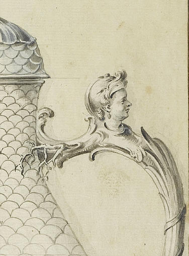 Gottlieb Friedrich Riedel Entwurf für eine Kaffeekanne mit Schuppenmuster, 1760 - 1770 Pinsel in Grau über Bleistift, gelb und grau laviert / Papier, 32,2 x 20,5 cm
