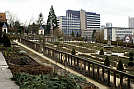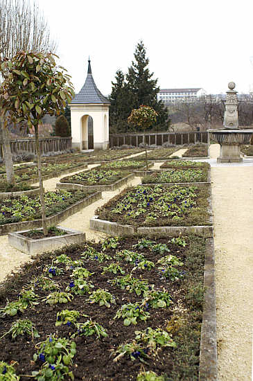 Mustern angelegten Beeten, die jeweils von einer Holzbalustrade