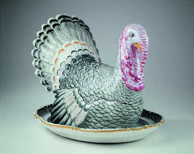Deckelterrine mit Untersetzplatte in Gestalt eines Truthahns