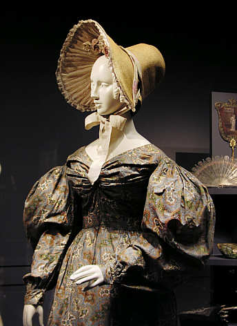 Um 1830 sind stark aufgebauschte Ärmel in Mode, "Hammelkeulenärmel" genannt. Das Kleid ist mit einer zeitgenössischen Strohschute als Kopfbedeckung kombiniert.