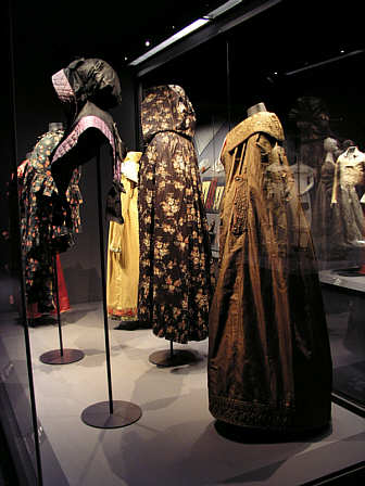 Capes und Mäntel In der Mitte eine Pelisse aus einem mit Blumen bedruckten gechintzten Baumwollstoff bestehender Umhang mit großer Kapuze. Im Hintergrund ein Mantel aus gelbem Wollstoff, der die Form der Empirekleider nachbildet.