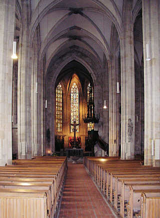 Dreischiffige Hallenkirche mit 6 Jochen, zusammen mit dem Langhaus der Heiligkreuzkirche in Schwäbisch Gmünd die früheste gotishce Hallenkirche in Schwaben