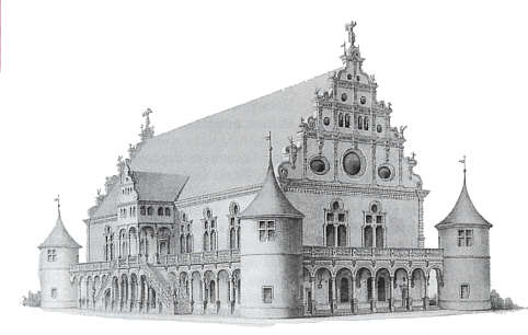 umlaufenden Altane mit vier Ecktürmchen umgeben war. Die Langseite war