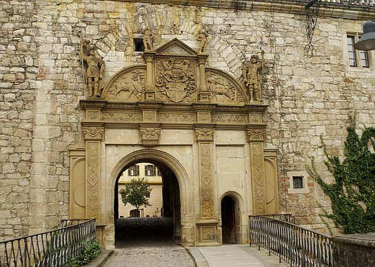 zwei Wächterfiguren links und rechts. Auch die dasWappen