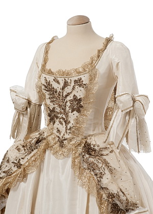 „Vor Beginn der eigentlichen Arbeit waren zahlreiche Treffen mit Milena nötig“, erklärt Alessandra Cinti, Besitzerin von The One, die die Kostüme für den Film kreierte. „Die Suche nach Materialien gestaltete sich lang und komplex, insbesondere was die Veredelung mit Spitzen, Stickereien und Applikationen angeht, von denen einige sogar Originale der Zeit sind. Einmal an die Kostüme genäht, haben die Garnituren dazu beigetragen, die Kostbarkeit der Stoffe noch zu steigern, wie im Fall des 'knusprigen' Seidenkleides, das Marie Antoinette für die Krönung trug - eines der schönsten und komplexesten der ganzen Arbeit.“.