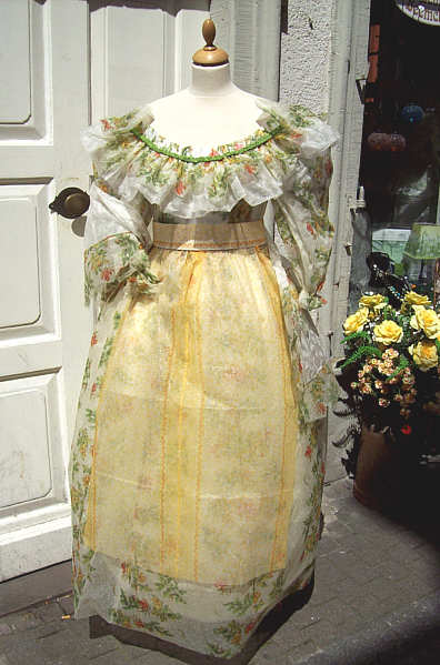 Biedermeierkleid im grünen Blumendekor mit gelber Bortenschürze und großen Volant am Ausschnitt