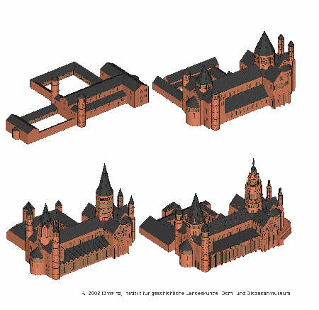 Modelle des Mainzer Doms um 1009, 1239, 1500 und 1970. Aktuelle