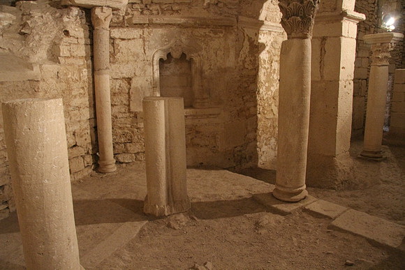 Die Kryptenanlage besteht aus einer innen liegenden Confessio, um die herum ein rechtwinklig abknickender Umgang führte. Im Scheitel dieser Konfession (und in Höhe der Mitte des Umgangs) öffnet sich ein dreischiffiger Gang mit drei Jochen (2x2 Pfeiler und 1x2 Säulen) zu einer sechseckigen Scheitelkapelle, deren sechs Säulen ebenfalls durch ein im Boden eingelegtes Sechseck verbunden sind.