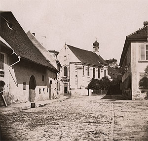 Oben: Das Adelhauser Neukloster zur Zeit der Aufhebung des Klosters. Aufnahme von Gottlieb Theodor Hase, um 1860.