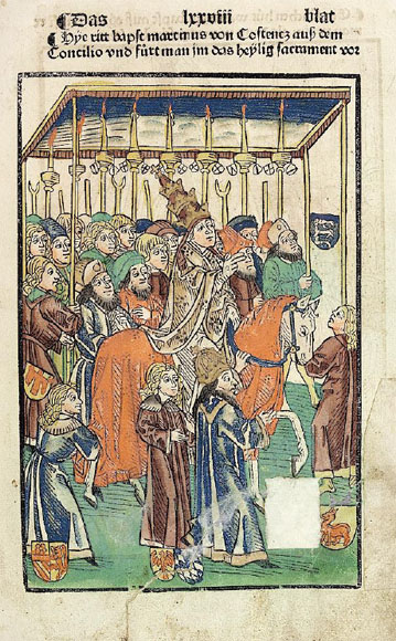Hye ritt bapst martinus von Costentz auß dem Concilio und fürt man im das heylig sacrament vor.