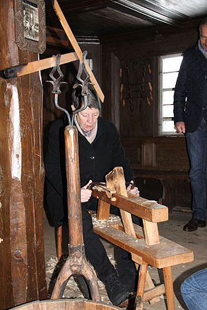 Links: Bundesministerin Barbara Hendricks testet im Resenhof in Bernau das Schwarzwälder Traditionsgerät zur Herstellung von (Dach-)Schindeln, den „Schniedesel“.