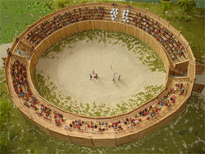 Die Reste eines ehemaligen hölzernen römischen Amphitheaters lassen sich in Künzing bei Deggendorf bestaunen. Archäologen machten den spektakulären Fund vor 15 Jahren. Die 35 mal 31 Meter große Arena bot einstmals rund 800 Zuschauern Platz. Foto: Tourismusprojekt Römerspuren/Museum Quintana