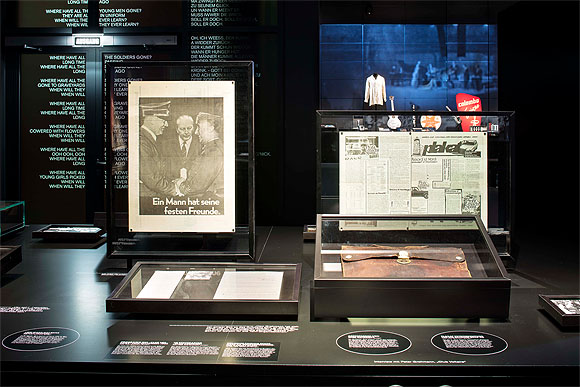 Unten: Bereich „Freiräume“ mit Aktentasche Rudi Dutschkes und Protestplakat von Peter Grohmann