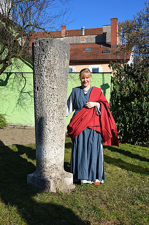 Kopie von Welser Meilenstein, Anfang 3.Jh. am Zwinger in Wels. Daneben die Stadtführerin Michaela Greisinger im Römischen Gewand.
