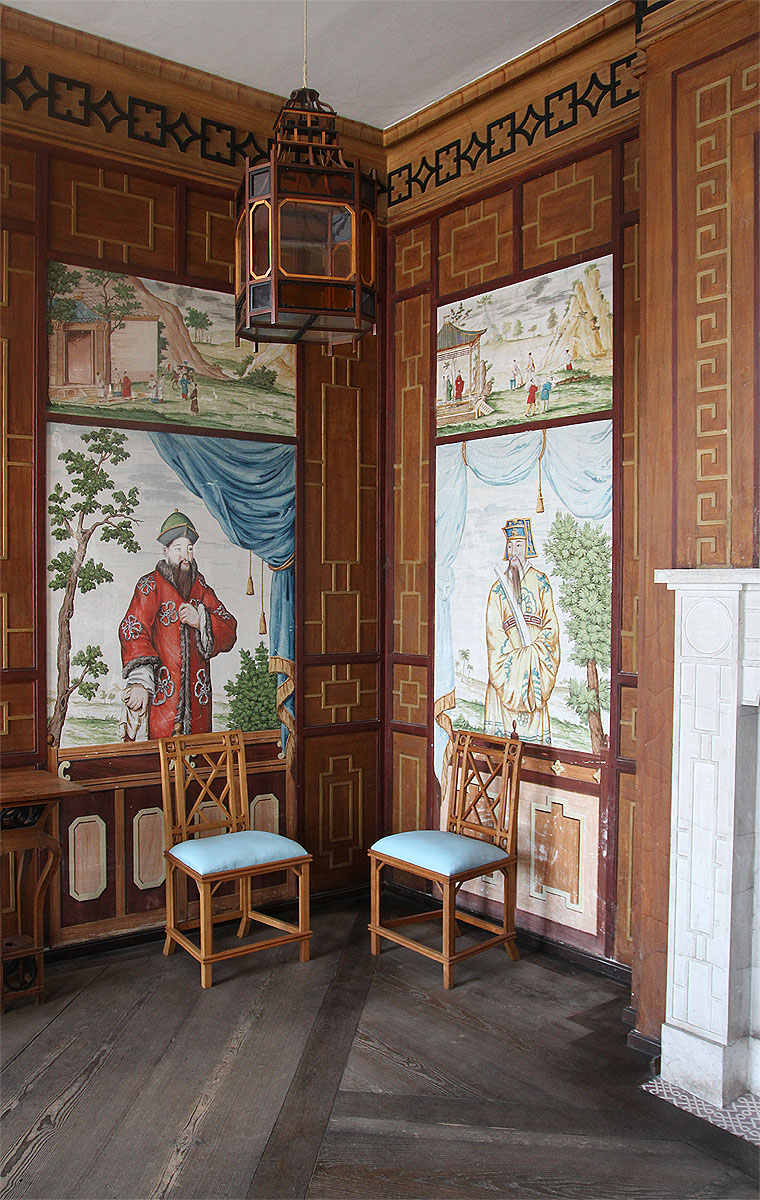 Die Innenräume sind indessen wieder restauriert und zeigen ausgezeichnete Dekorationen in chinesischem Stil. Lebensgroße Figuren, vermutlich von Hand auf die Seide der Wandbespannung gemalt. Höhepunkt ist indessen ein Saal im Seitenflügel. An der Schmalseite – man sieht, wenn man sich dem Saal nähert, schon eine goldene Dekoration auf hellblauem Grund, die sich beim näheren Hintreten als Schauwand für chinesische Porzellane erweist. Der Raum selbst ist mit einer goldgeprägten Ledertapete ausgestattet
