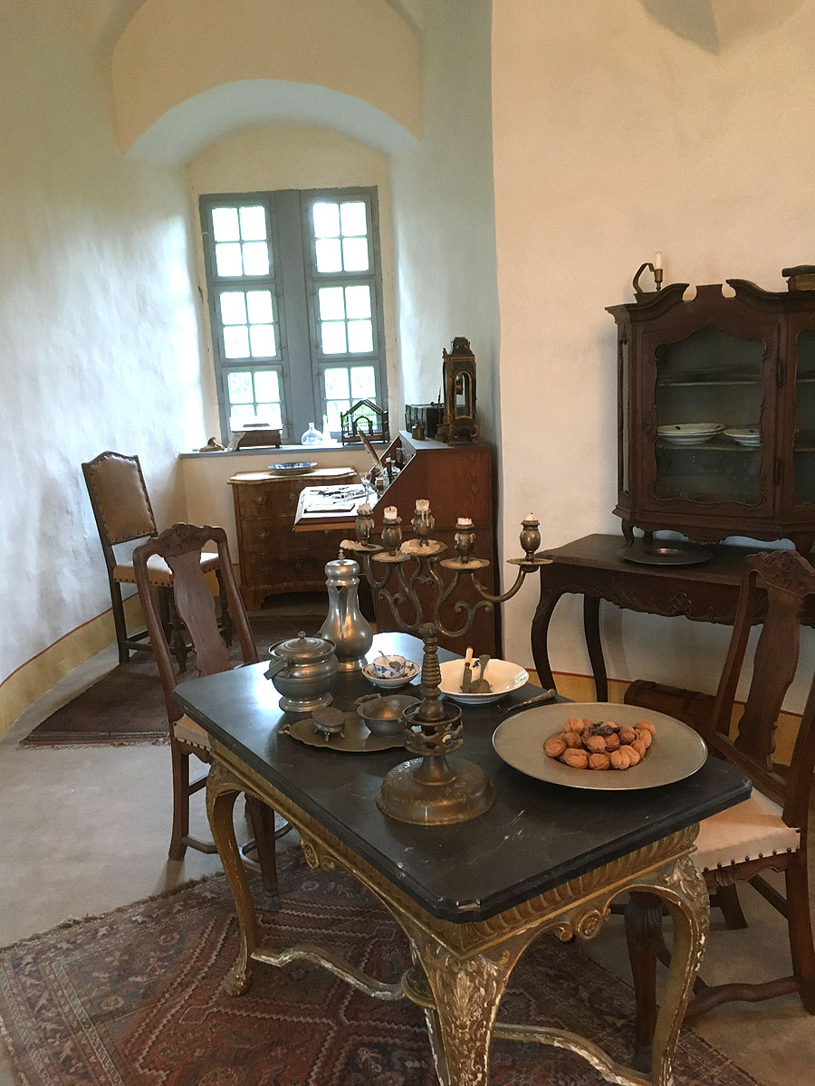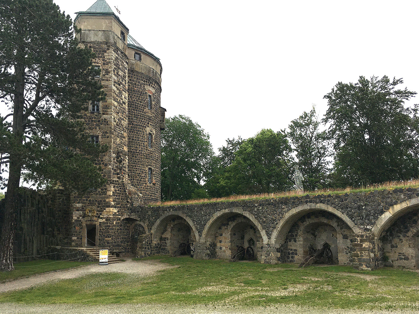 Schon beim Betreten der Burg fallen die Basaltsäulen auf, sie stammen von dem vor Urzeiten hier tätigen Vulkan, und der fünfeckige Grundriss der Säulen kommt von der kristallinen Struktur des Erstarrungsgesteins. Alle Mauern der Festung sind praktischerweise auf diesem Gestein. Dass sie mit dieser dunklen Farbe ziemlich schaurig und drohend aussehen, war vermutlich ein willkommener Nebeneffekt. Das einzige Freundliche war der weiß verputzte einstöckige runde Barockpavillon an Tor, vermutlich ein Wachhäuschen.